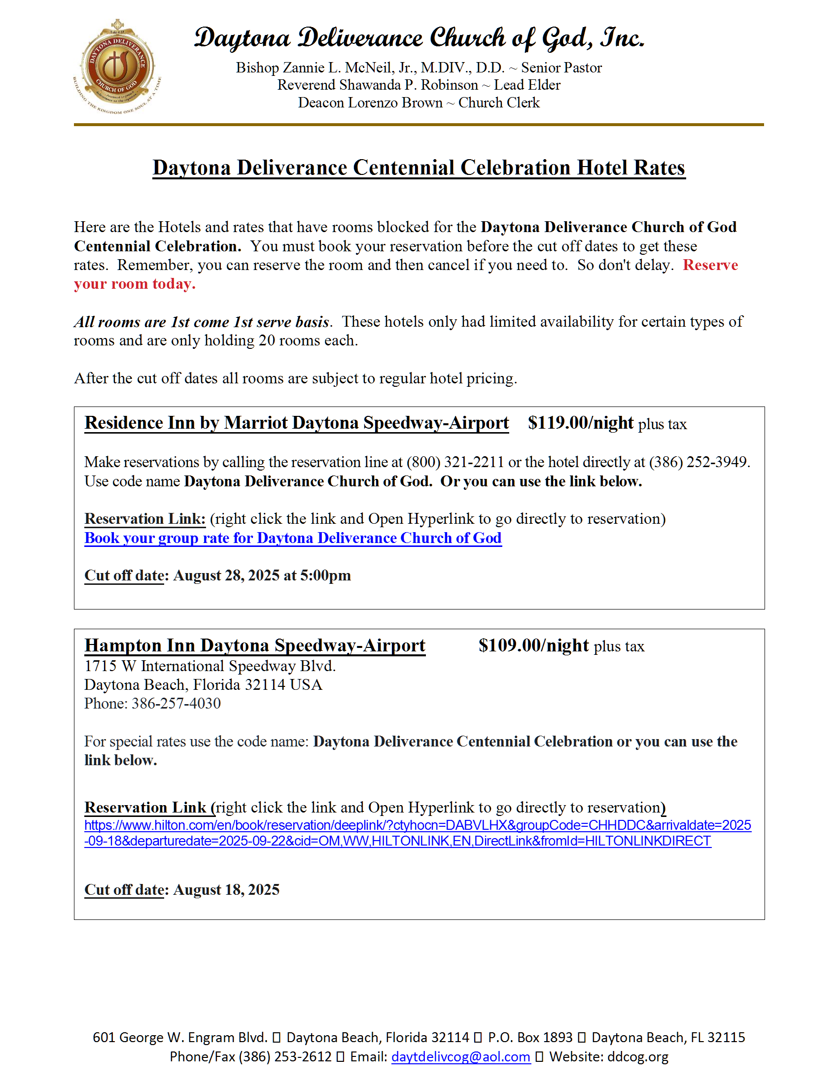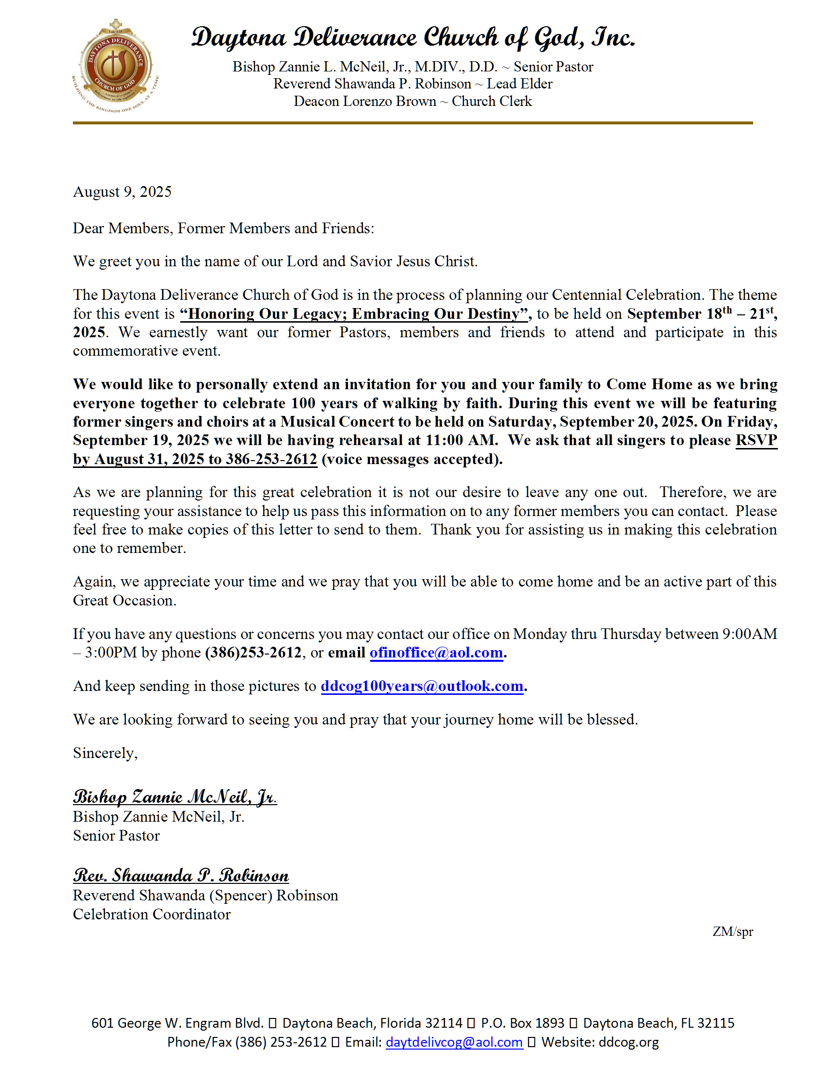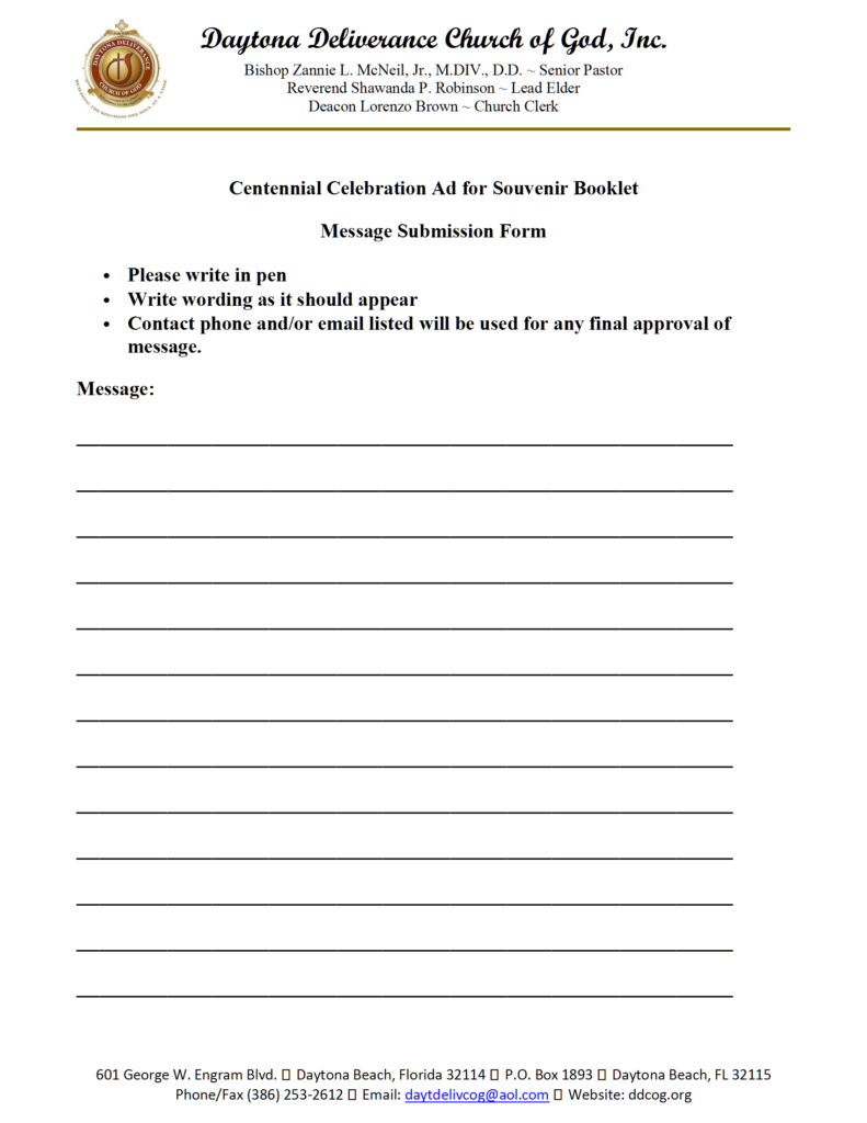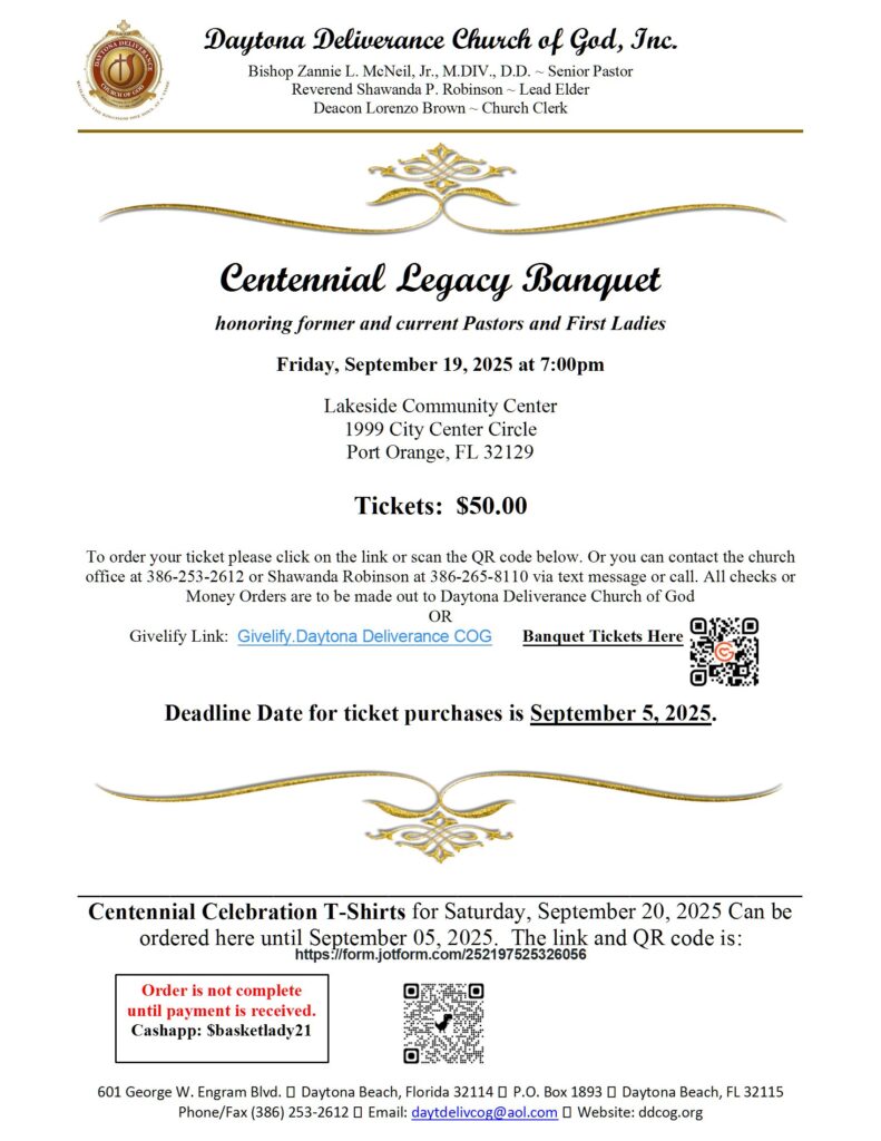 Members (past and present) and Regular Attendees …… a very special and monumental time is approaching Daytona Deliverance Church of God (formerly known as Daytona Beach Church of God, Campbell Street Church of God, Christ Kingdom Church of God). In a few years, Daytona Deliverance will celebrate 100 years of ministry. Yes, our Centennial Celebration is round the corner. The celebration committee would like to capture the years of ministry and impact through your lens and view points. If you have any pictures or even documents (past or present) you’d like to share, please email copies of them to Elder Robinson at DDCOG100years@outlook.com or reach her via text at 386-256-8110. Event details,etc TBA.